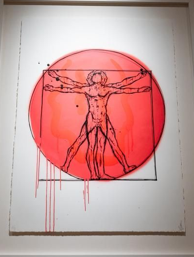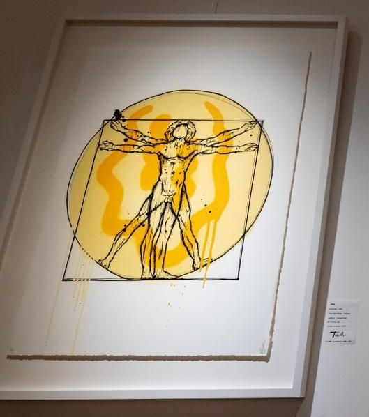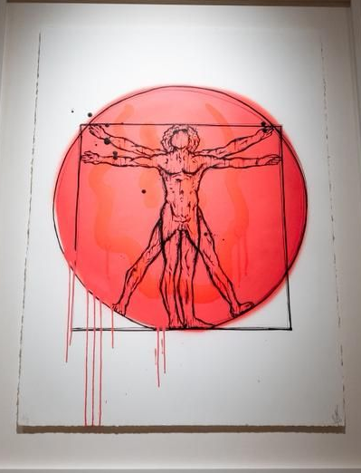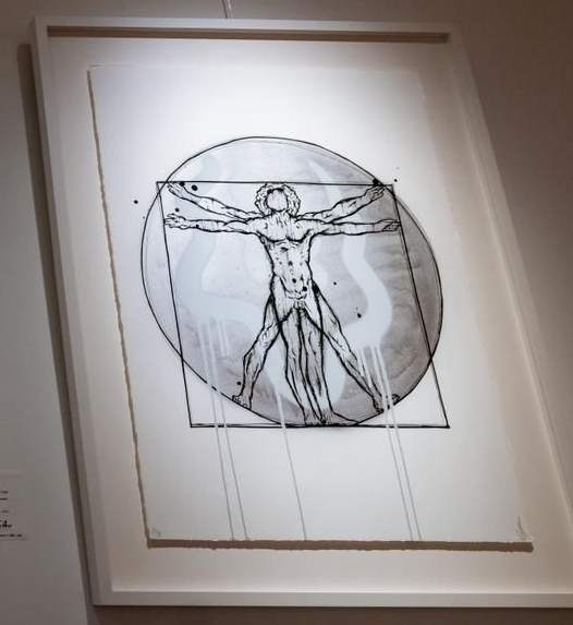De kunstwerken, zijn eerste silkscreens, gecombineerd met handgeschilderde smileys en geïnspireerd op een van de meest iconische tekeningen ooit. Een samensmelting van gevoel en expressie – verbeeld in de smiley – met de wetenschappelijke benadering van Leonardo da Vinci.